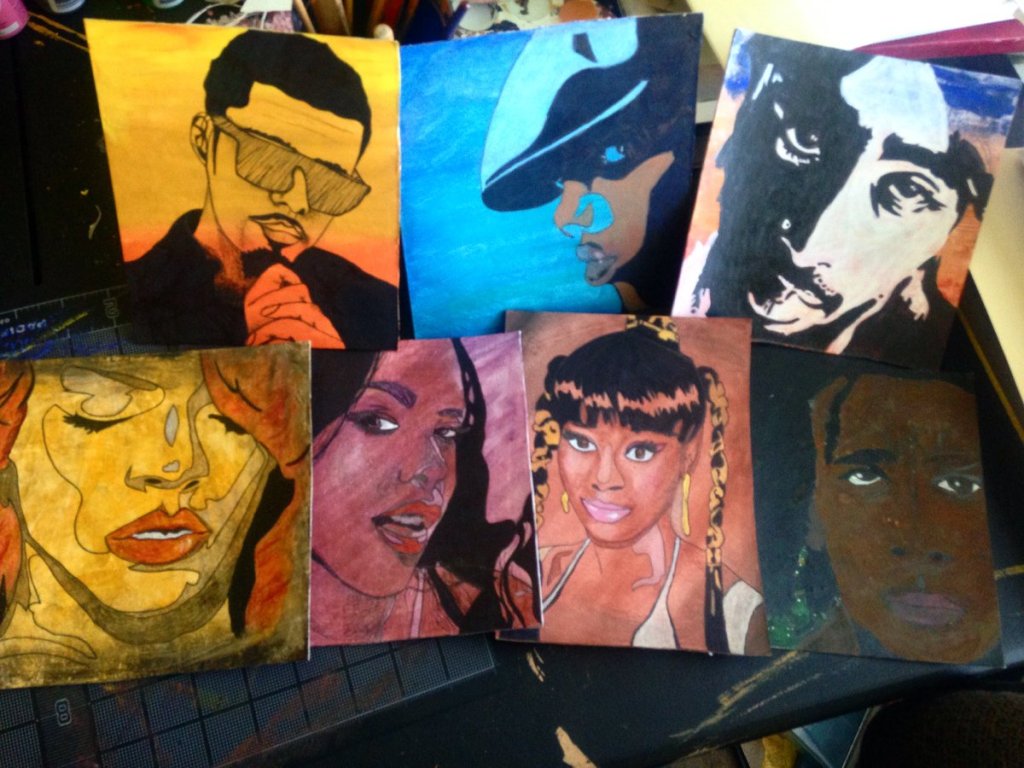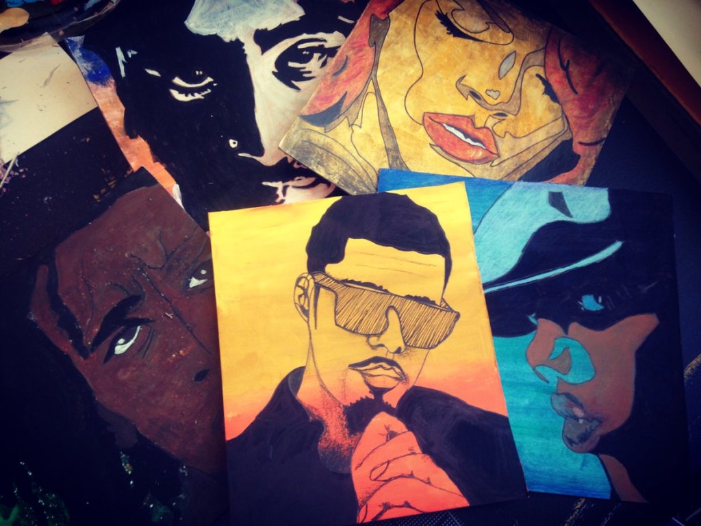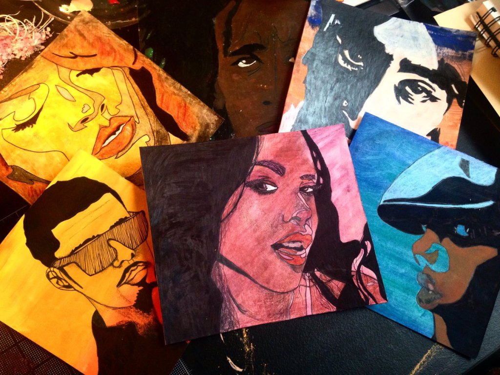 I always start off with a thin layer of either acrylic or gouache (watercolor paint). Then I draw whatever person or figure I’m interested in at the time onto the first layer once it is dry. Now my art subjects are always based on what music I am listening to at the moment, that is why they are called Music Blocks. This should tell you that my therapy is a lot different from a typical therapy session. When a person hears the word therapy, they often think of the word ‘quiet’ as well. My art therapy sessions are the complete opposite. I am one of those people who can not really focus when things are 100% quiet. I need some sort of a beat banging in the background or someone playing music to keep me focused while working often, especially for this particular series. What type of music I am listening to during those moments also determines what type of mood I am in. For example, the Block shown below features Baltimore, MD singer Jasmine Sullivan. Well at the time of this painting, I was upset well more like frustrated due to financial issues that we all go through from time to time , and one song that always stuck out to me during troubling money times for me is ‘Silver Lining’. Well while I was upset and agitated, I ended up taking my frustrations out with this art piece.