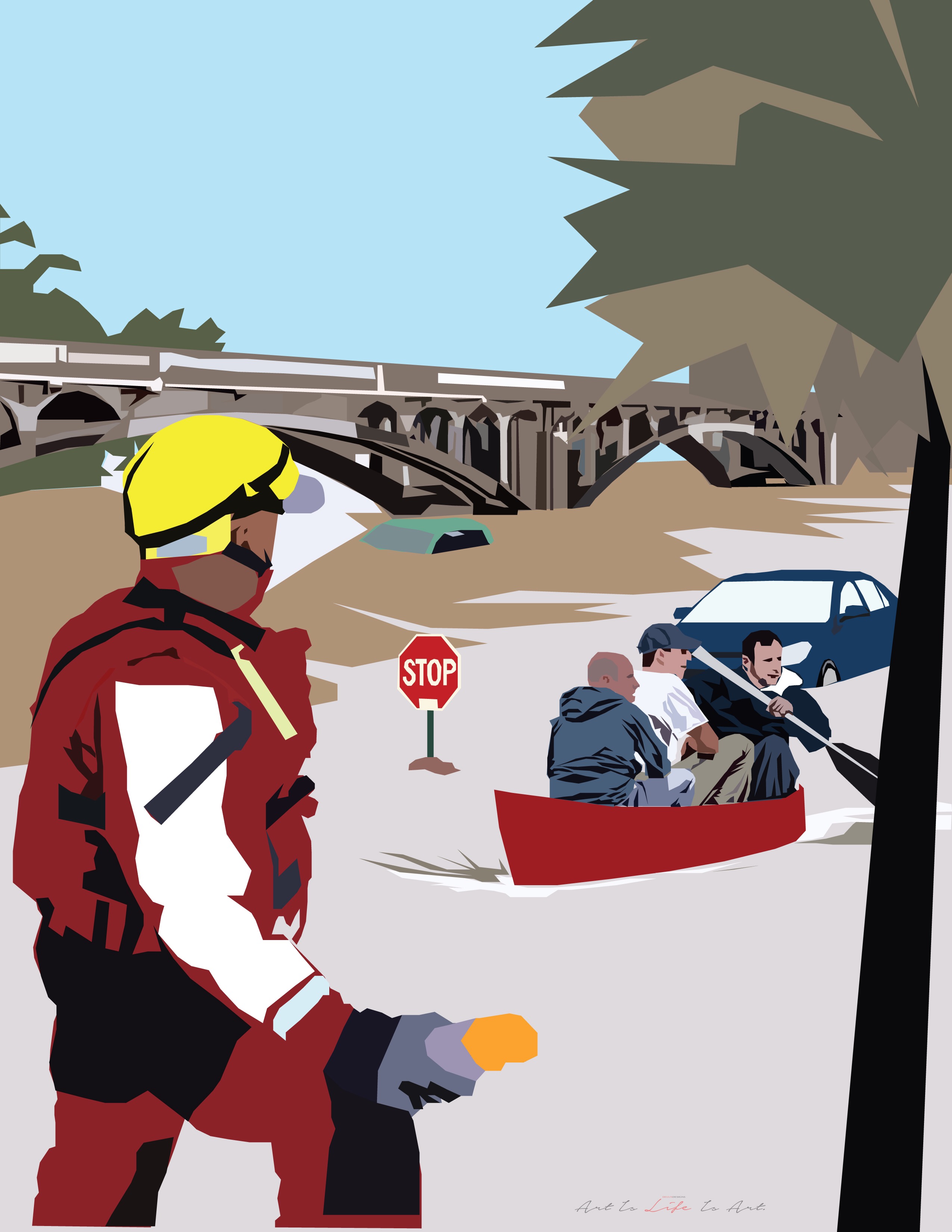 This particular art piece was created to depict a very frustrating time period for the state of South Carolina, mainly the Columbia, Charleston, and Myrtle Beach areas of the state. Being a native of South Carolina, we don’t normally have any major weather disasters here. Of course there are your normal occasions of bad thunderstorms that may come through from time to time during the Spring months and produce a tornado here and there, and of course the heat is always a big deal here as well. But when it comes to anything else major, we are normally sparred away from that sort of thing. From my 25 years of living, I believe the last major weather incident that occurred here was Hurricane Hugo in September of 1989. In October of 2015, just two years ago, that all changed. SC Flood was created as a depiction of what happened to our state during one of our biggest flooding disasters in history. After over 11 dams began to break in the Columbia area along with additional rain, the flood of 2015 put South Carolina at a complete standstill with over 50% of our state being underwater, forcing many to pack up and evacuate their homes for higher grounds. During the flood, 15 people from SC were killed even though evacuations were ordered, 9 people drowned and 6 people died from car accidents while fleeing from the rising water. More than 175 people had to be rescued and over 800 people residents of SC had to be placed in temporary housing. Bridges were severely damaged all over the state and some roads were completely washed out leading to interstate closings down in the Low Country of South Carolina. Summerville, SC residents reported seeing caskets from graveyards floating down the road after so much rain fell and saturated the grounds so much that the water itself ended up pushing caskets up out of the ground. Apartments and homes were looted during this time period as well, so many not only lost valuables and memories due to the water, but they also lost things from others going in and taking them while everyone was evacuated from the area. The illustration below gives just a small glimpse at how things looked during that time period. Similar to our Hands Up, Don’t Shoot illustration, multiple images and photographs from this time period were combined to create a complete illustrated image. The bridge shown in the background is one from Columbia, SC that represents the structural damage that occurred during the floods of 2015. The palm trees and regular trees are from a couple of images out of Summerville, SC and Myrtle Beach, SC during this time period. The cars in the flooded waters are from images out of Columbia, SC and Charleston, SC. The stop sign and the people in the boat were randomly selected from various photos reported out of the SC area during this time. The main focal point of the illustration would be the natural disaster worker which was taken out of Columbia, SC. He was placed in the design to show how he was helping the residents who were in the flooded cars, and now are rowing the boat, back to safe grounds. I went back and forth with deciding if I wanted to create the sky in a cloudy and rainy fashion or your typical blue. Clearly, I chose blue but only as a positive piece for the artwork. I decided to make it blue as a representation that bad times don’t last always and there is always sunshine after the storm.