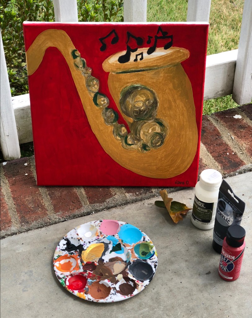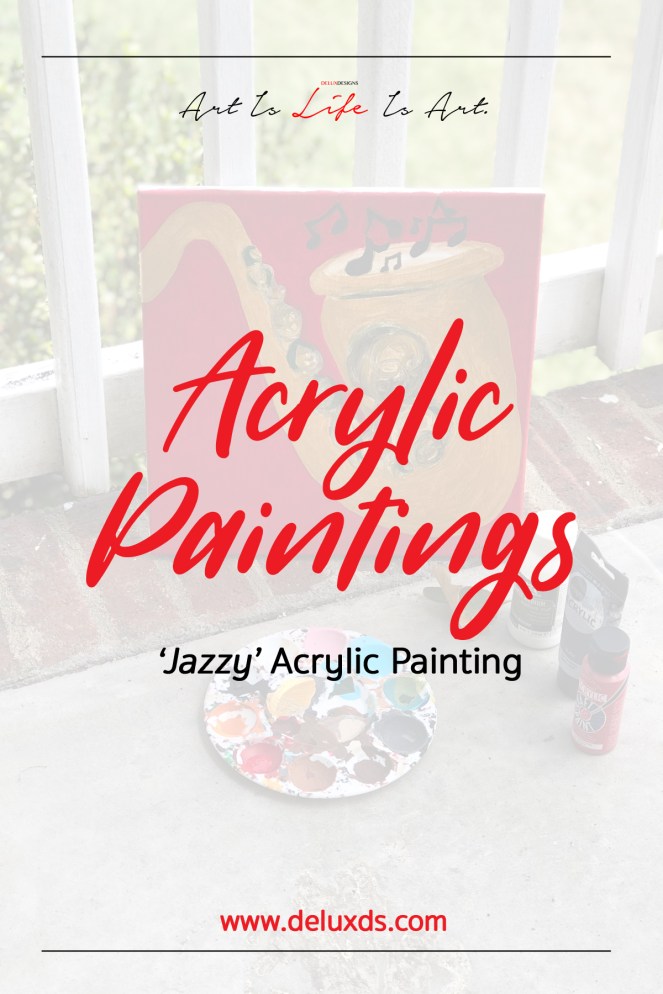 Used to create this piece are our favorite Anita’s Acrylic Paint from Hobby Lobby on a 12×12 inch Wrapped Canvas Board from our affiliate partner Michaels Arts and Crafts store. Used to prime the canvas is Liquitex Primer also from Michaels Arts and Crafts store. The concept of the painting stems from Jazz music itself, I wanted to depict a saxophone but of course in my own artistic way by sticking to a limited color palette of just red, metallic gold, black and hunter green. The white areas are not paint, those are areas of the canvas surface that I left showing under the paint.