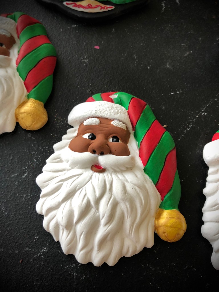 This handmade Black Santa Christmas Ornament is a hand painted by Visual Artist Keara Douglas onto a ceramic hanging ornament with Acrylic Paint. This is a great decoration option for the Christmas holiday season.