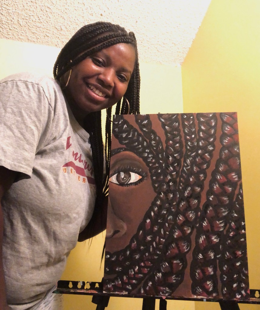 Today we have a new painting from our founder and visual artist Keara Douglas. This 12×16 inch acrylic painting is titled Braid Love. It has been created to show a love for the hairstyling method of braiding. It features a lot of detail more to the hairstyle itself than the woman’s face as a main focus and focal point. Braid Love was created on a flat canvas panel using a combination of Anita’s Acrylic Paint from Hobby Lobby and Master’s Touch Acrylic Paint as well. The Canvas Panel itself came from Cheap Joe’s Art Supply in Charlotte, North Carolina. They always have great deals on art surfaces and these work out great for the type of paintings created. They are also already primed for the paints of our choice so it takes some of the work out of prepping so we can get right into creating.