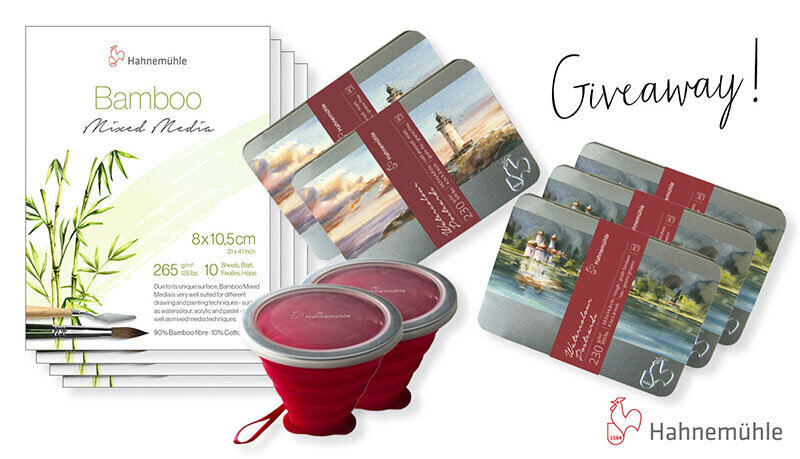 Enter for a chance to win FOUR Hahnemühle Bamboo Mixed Media paper pads (this natural-white artist paper is very well suited for different drawing and painting techniques as well as mixed media techniques), THREE Rough Watercolor Postcards Tins, TWO Cold Pressed Watercolor Postcard Tins, and TWO Collapsable Water Cups.