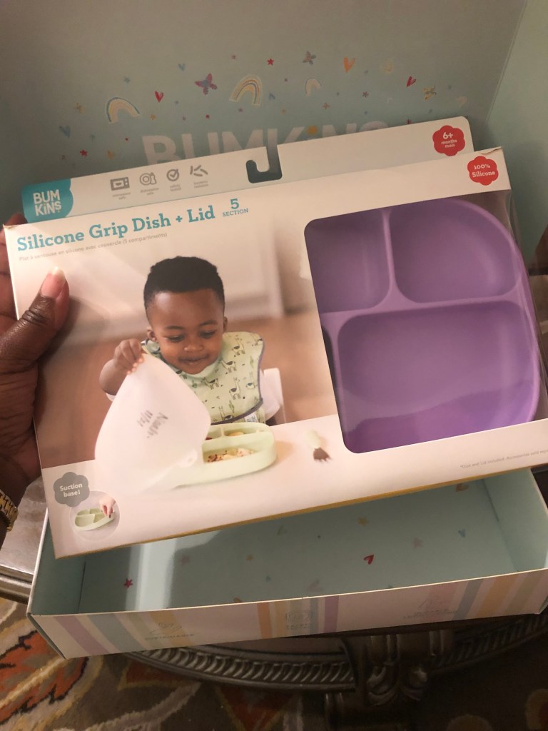 The first thing I can say about Bumkins is that I love the packaging. You can check out a full unboxing video that I done previously to show their great packaging on my Instagram page here. Receiving any product with great packaging is always a favorite and this one is one of my favorite brand partnership packages received for that one reasoning. Everything was packed perfectly and easy to open and reveal so I want to thank those who packed this shipment for providing extra care and love in my experience of just opening the box. Our Bumkins set came with a Splat Mat, a Smock Apron, a Silicone Grip Dish and Lid, and some Wet/Dry Bags for us to use.