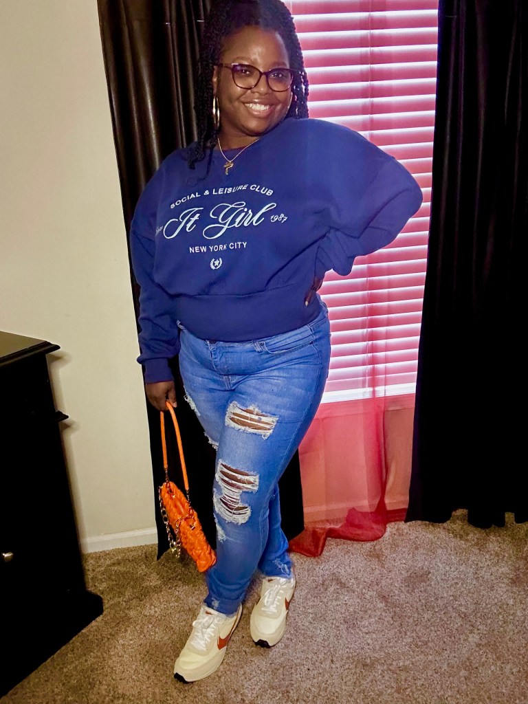If you haven’t noticed already, Target is one of my all time favorite stores that I love to shop from, especially during the Fall and Winter seasons yearly. They always have such cute and unique fashion choices and most of the time I never see the same items at different stores, it’s always something new I’m finding randomly from store to store. I came across this Grayson Threads Sweatshirt from a recent visit in store. It’s really comfortable and I can pair it with pretty much any type of look I decide to this holiday season. For the first look I opted for a casual fit with jeans and sneakers, plus a clutch to pull all the colors together. The tongue of my shoe is the same color as the letters on my Sweatshirt so everything came together pretty good.