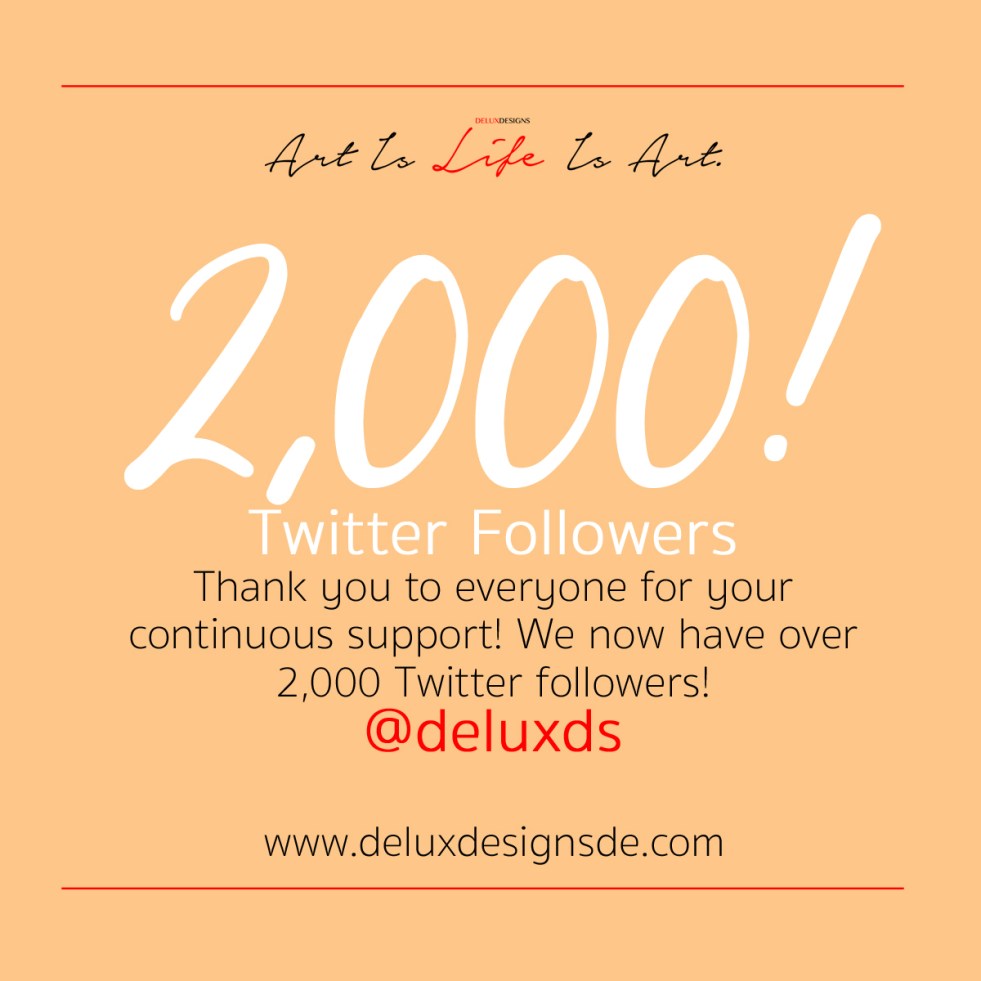 Thank you to everyone for your support and for following the art journey of Delux Designs (DE), LLC this far! We have now hit more than 2,000 followers on Twitter! I know some may think this is nothing, but to me it means the world that so many have decided to support our brand! Many…… Continue reading 2,000+ Followers on Twitter