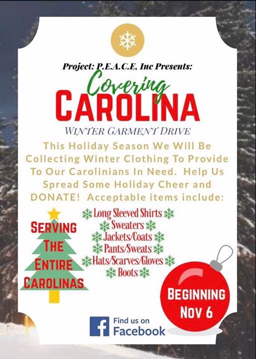 Our non-profit Education Expo has team up with Project PEACE to participate in the Covering Carolina Garment Drive going on right now all over South and North Carolina! We will be taking up apparel donations for those in need at various locations across the Carolina’s for the month of December and need your help to…… Continue reading Education Expo – Covering Carolina Garment Drive