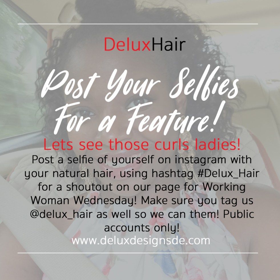 Lets see those curls ladies! We know you are working hard on this good Wednesday and we want to feature YOU on our page in light of all that you continue to do for yourself and your family while working everyday of the week and also maintaining those curls while doing it! Follow us on…… Continue reading DeluxHair – Working Woman Wednesday!