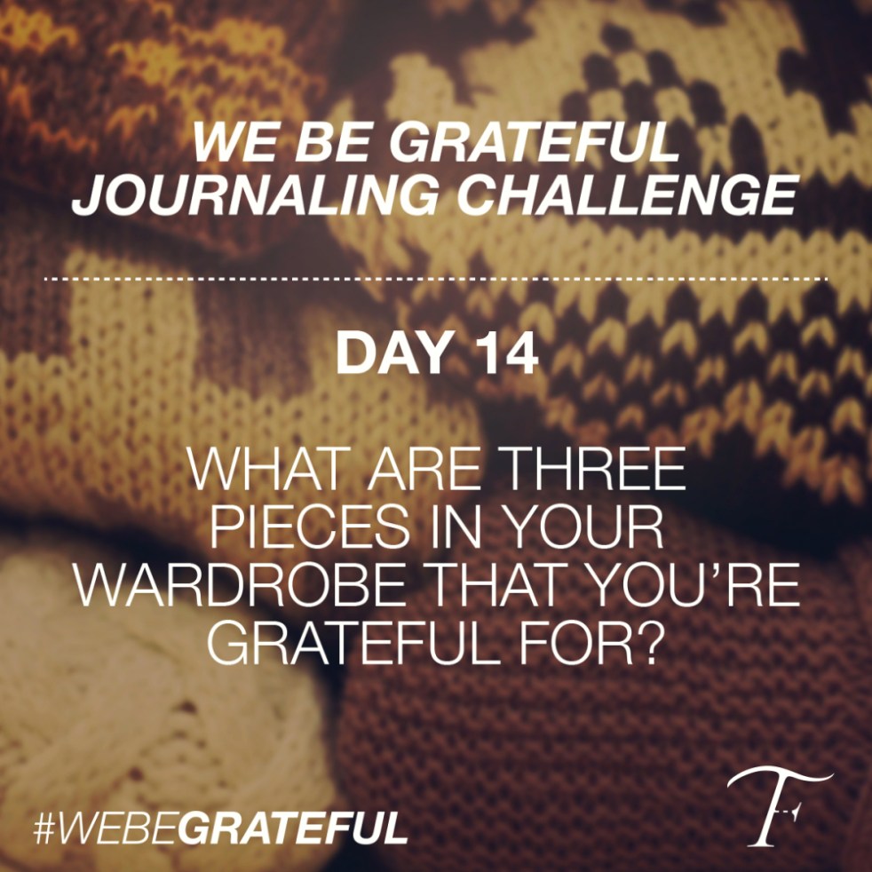 Day 14: What are three pieces in your wardrobe that you’re grateful for? A14: Three pieces in my wardrobe that I am grateful for right now would be my jacket/coat for starters. Many are not blessed to even have that extra layer of protection from the colder temperatures which always makes me thankful for my…… Continue reading #WeBeGrateful – Day 14